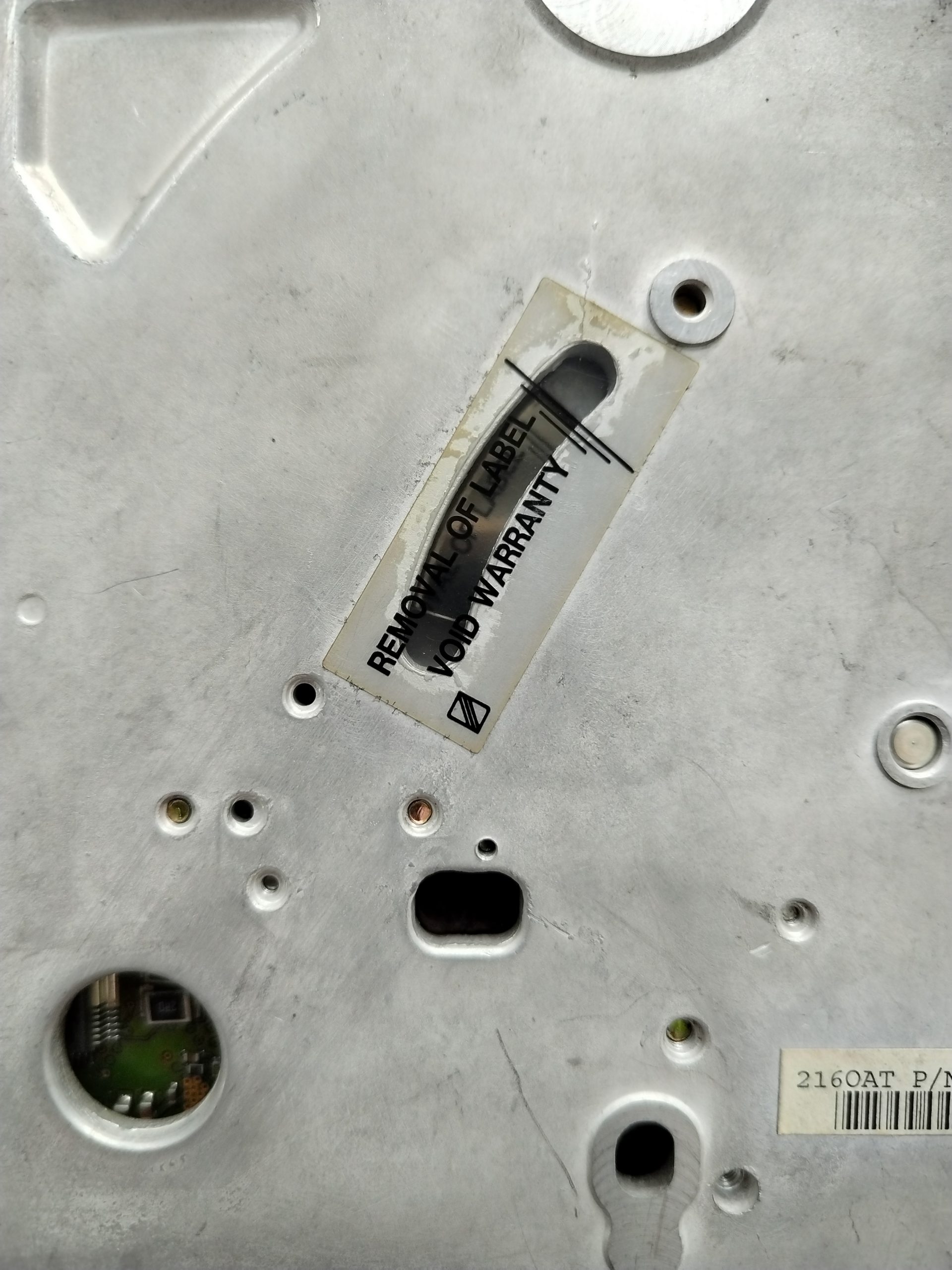 压箱底的一块5.25英寸的昆腾Quantum 大脚Bigfoot CY系列 2160AT机械硬盘。记得应该是上个世纪末的产品了。上面装的竟然是Win98,而不是Win95.这块盘,当时价格应该在1000元以上!虽然称之为是大硬盘,其实是有两个方面的意思。一个是尺寸大!5.25英寸,盘体长20.3cm;另一个意思是容量大!2.1G大容量。要知道当时的硬盘大都为XXXMB,几百M的容量。