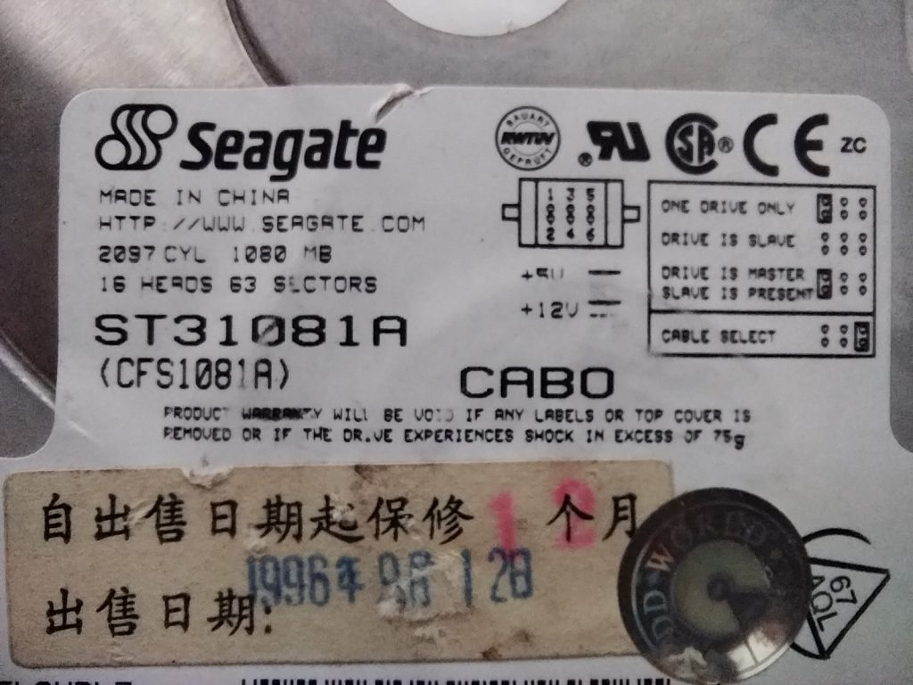购买于1996年9月的希捷ST31081A,MADE IN CHINA!在当时,1080MB,绝对的大容量硬盘!要知道当时安装Windows95操作系统仅需要有120MB的容量就可以,Windows98也不过仅需要260MB的C盘即可。只记得我当时上网的时候,用的是Windows98。硬盘一般都是几百兆,1G以上的真的属于大容量硬盘了。这片硬盘,保存到现在,成色还是这么靓!还真是当文物来收藏的!(后面还有片产于1994年7月的老昆腾ProDrive LPS 540AT,容量540MB。)