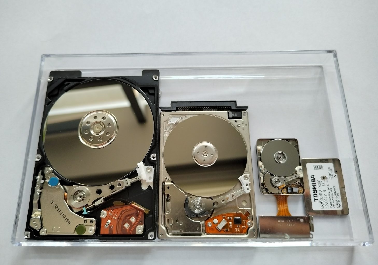 拆开后,放进了展示盒里。由左向右分别是:2.5寸硬盘→1.8寸硬盘→0.85寸硬盘