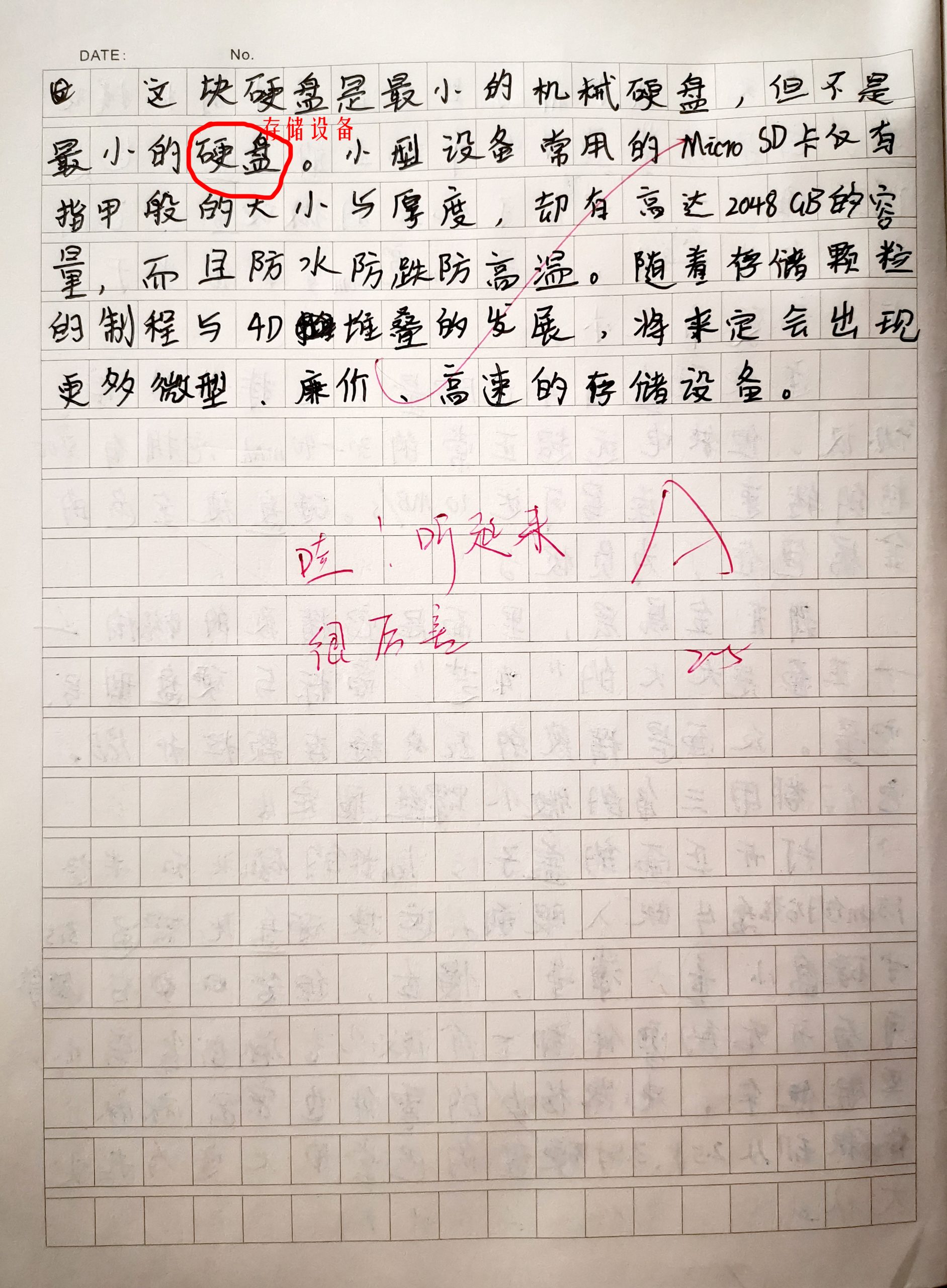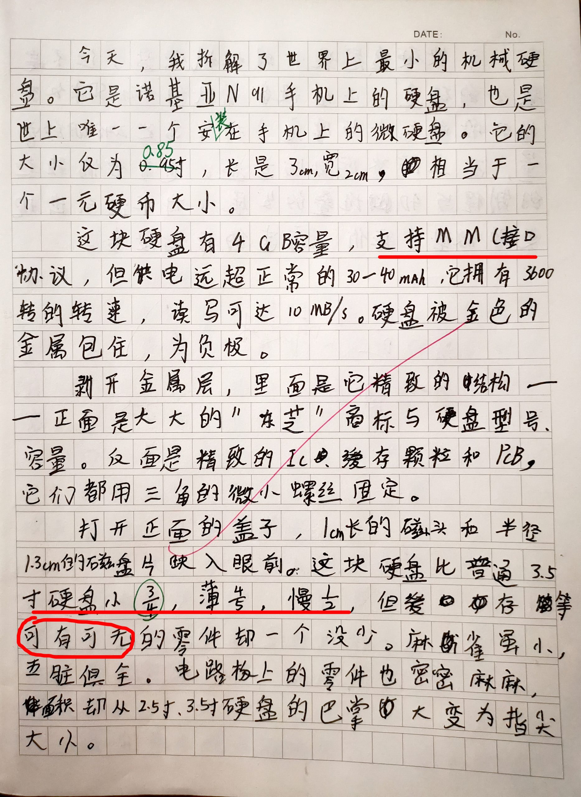 由左向右→2.5寸笔记本硬盘→1.8寸硬盘→本硬盘0.85寸 PS:送给儿子了一片,作为开学考的奖励。次日他就偷写了一份日记,如下: