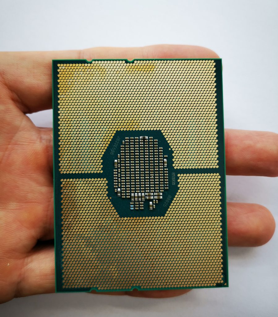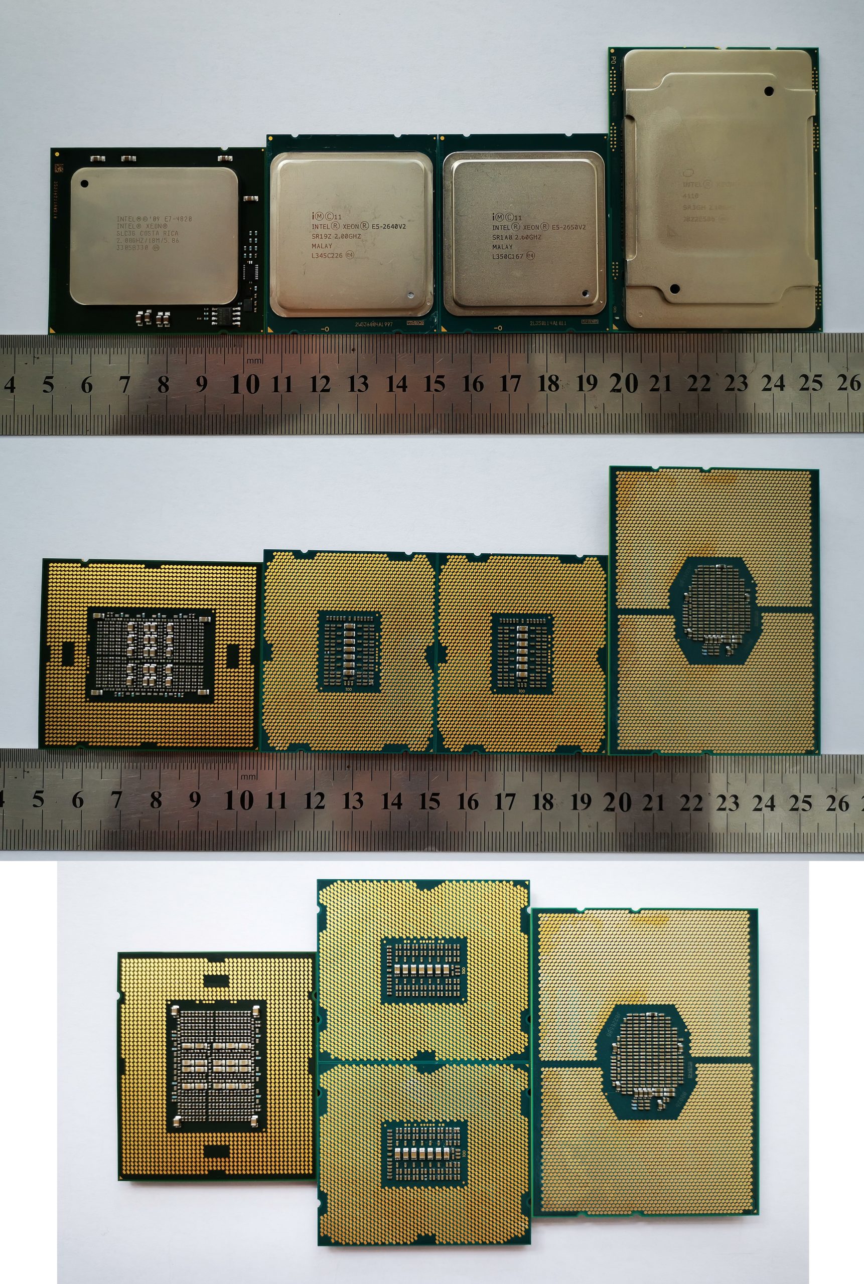 3647针 几款陆续淘汰的至强(自左向右)对比:1567针E7-4820→2011针E5-2640v2→3647针Silver4110