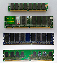 从上到下依次为:72线EDO内存、256M SDRAM、DDR、DDR2、DDR3、DDR4。...